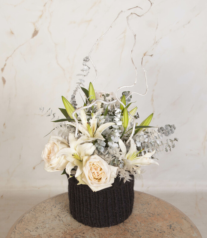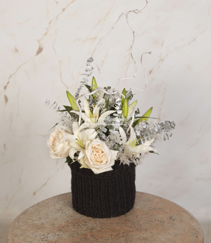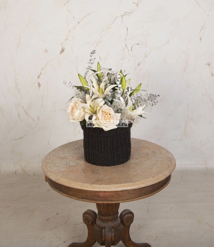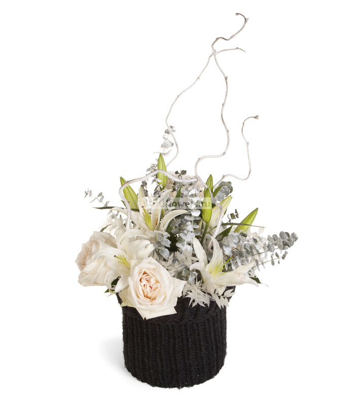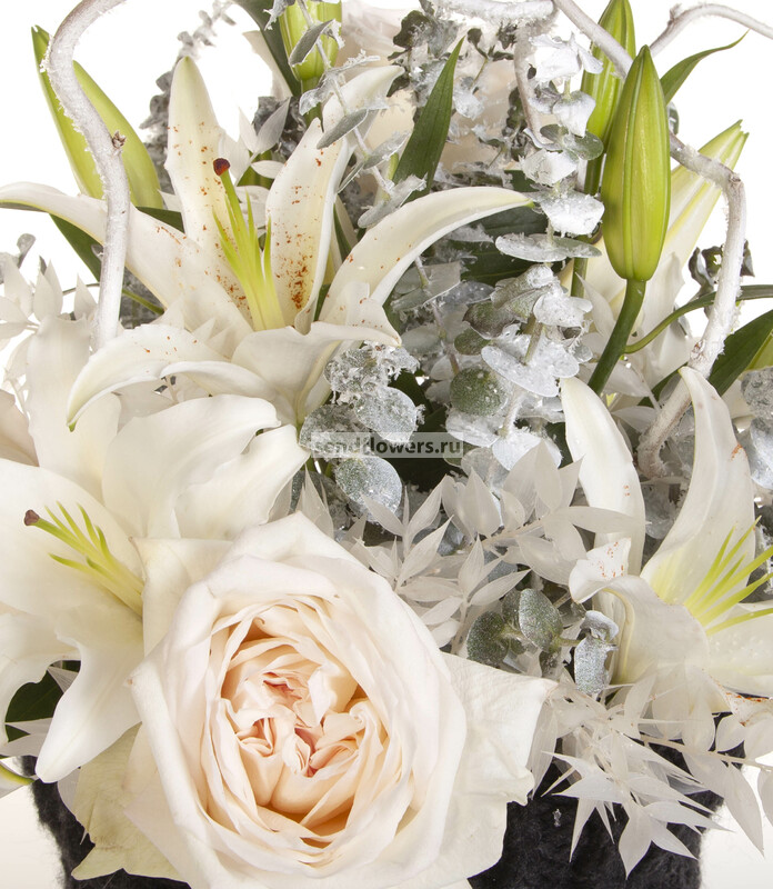 Состав: Эвкалипт (4), Оазис кирпич (2), Корилус (3), Снег искусственный (2), Лилия восточная белая (3), Роза White OHara (3), Бархатная коробка черная (1), Вязаный чехол на коробку (1), Рускус итальянский белый (5)