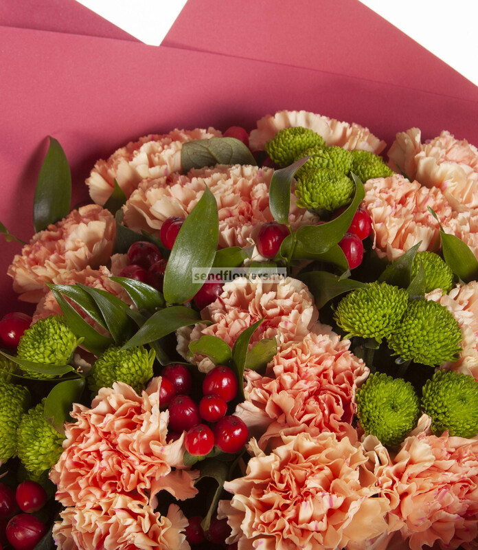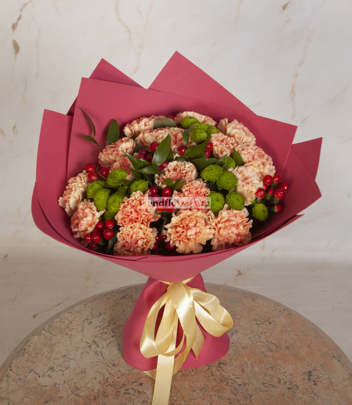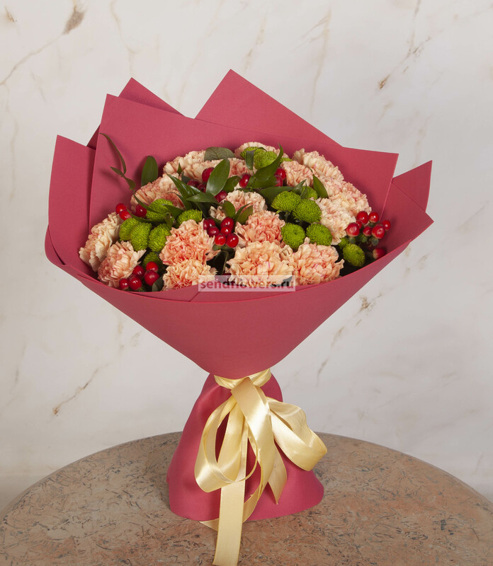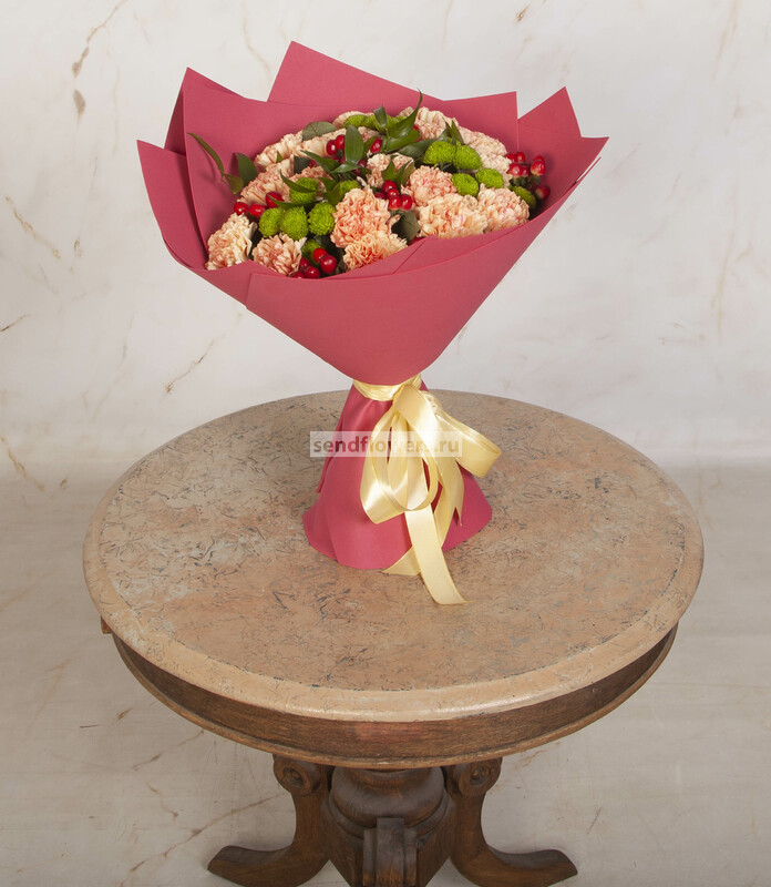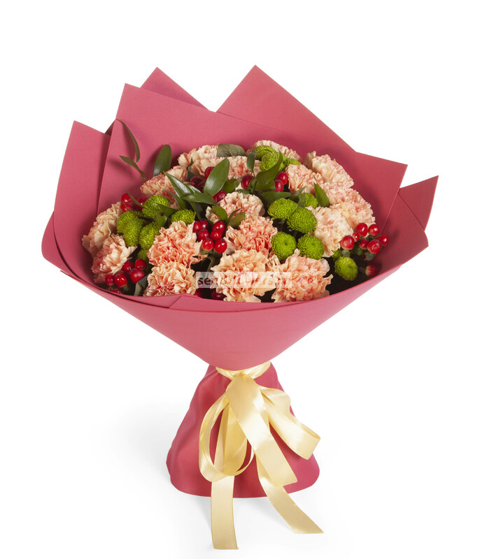 Состав: Гиперикум красный (7), Лента натуральная (3), Фисташка (5), Хризантема Сантини зеленая (3), Фоамиран (2), Гвоздика Novia (19)